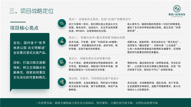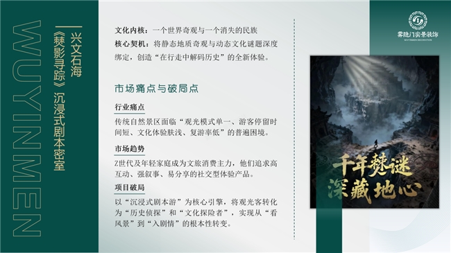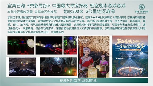 《僰影寻踪》为中国最大寻宝探秘密室剧本游戏,入选 2026 年央视春晚取景地,获宜宾电视台推荐,是 5A 景区活化利用的典范项目。项目落地 5A 景区兴文石海,以喀斯特地貌为载体,深度融合僰人文化,将溶洞、石林、地下河转化为实景剧情场景,通过解谜、互动实现地质科普与文化体验融合,激活景区静态资源。项目落地后,带动景区客流增长1.5 万人次,过夜游客占比提升30%,二次消费占比达56.9%,首次超过门票收入。