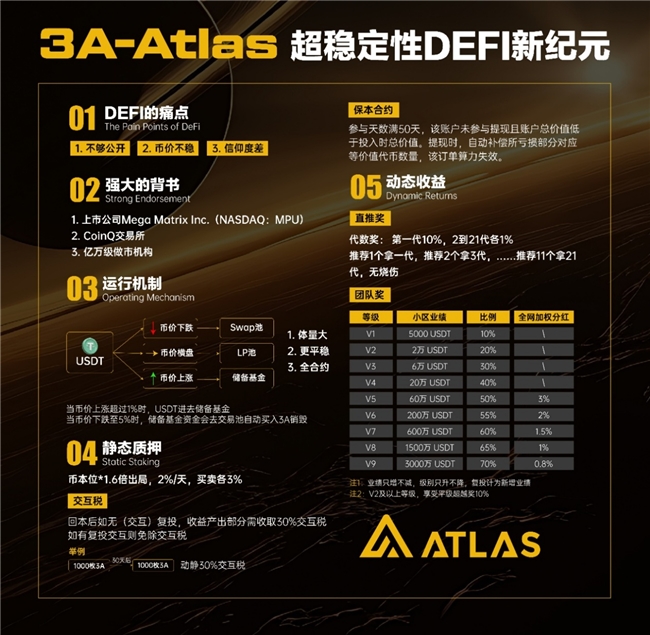 3A-Atlas 是立足 2026 年 DeFi 合规化、机构化、稳健化新趋势打造的超稳定结构化去中心化金融系统,由美股上市公司 Mega Matrix Inc.(NASDAQ: MPU)提供合规与国际信用体系支持,CoinQ 交易所赋能核心技术与全流程风控,联合顶级做市机构共建生态,全面突破传统 DeFi 高波动、弱安全、缺合规的行业痛点,以可持续经济模型重构金融价值循环,开启超稳定 DeFi 新时代。