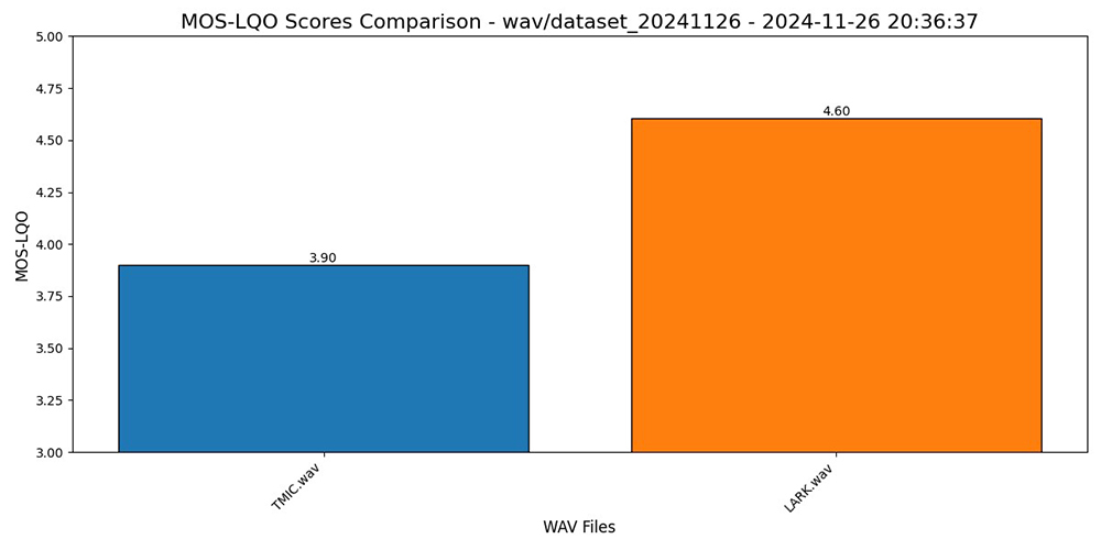 星闪麦克风具有48KHz采样率、24bit量化编码位数和4Mbps传输带宽的高性能设计,使得其在基于感知模型的音质评价工具Visqol计算出的MOS-LQO的客观分数(范围1.0~5.0,分数越高音质越好)达4.6高分。
