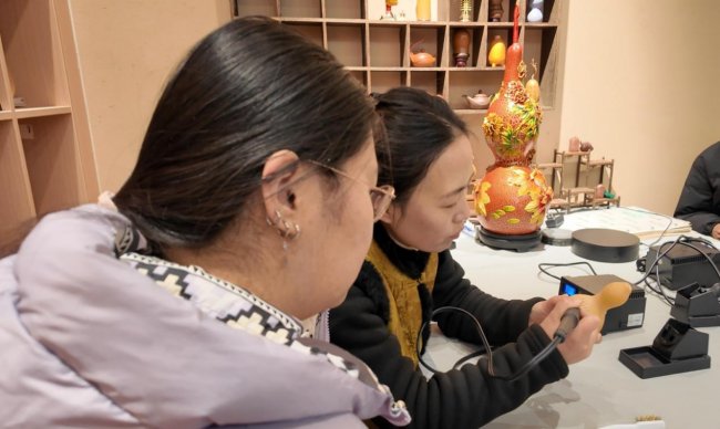 图为团队队员在传承人讲解下学习葫芦烙画非遗技艺 曾德冉 供图