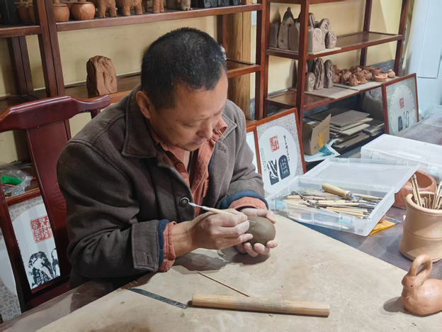 2025年7月26日,实践队来到张伟、张锦霞夫妇的澄泥雕塑工作室,与两位民间手艺人面对面交流,近距离学习澄泥雕塑技艺。现场,张伟、张锦霞夫妇向队员们展示了首次亮相的澄泥与草编结合创新作品,这批作品既保留了澄泥温润如玉的质感,又融入了草编自然质朴的纹理,传统工艺的跨界融合碰撞出别样的艺术火花,为非遗技艺的创新发展提供了全新思路,让队员们眼前一亮。