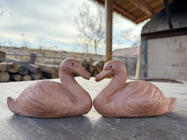 随后,实践队一行走进张伟、张锦霞夫妇的澄泥工作室,古雅的创作环境中,满是手作的温度与时光的沉淀。夫妇二人分工协作,向队员们倾囊相授澄泥制作的核心技艺,从选泥的考究、捶打的力道,到塑形的巧思、细节的雕琢,每一个步骤都耐心示范、细致指导。队员们躬身实践,在老师傅的点拨下反复打磨,将对澄泥文化的理解与巧思融入创作,原本普通的澄泥在指尖逐渐成型,一只憨态可掬、灵动生动的小天鹅泥塑最终完成。质朴的泥塑不仅定格了黄河边的文化韵味,更让队员们在亲手创作中体悟到澄泥技艺的独特魅力。