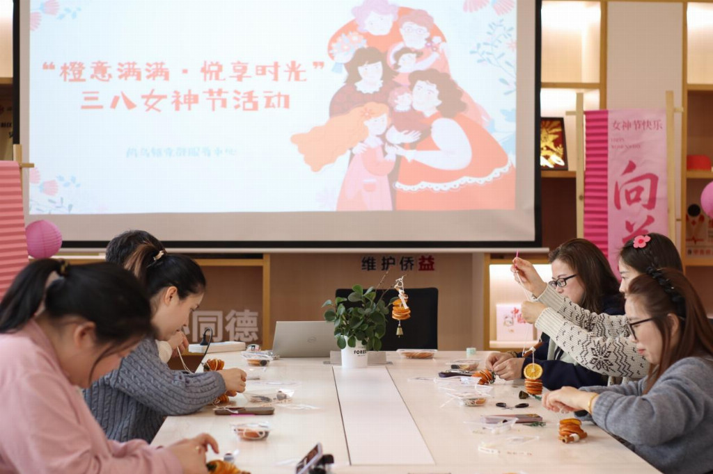活动现场布置得温馨雅致,处处洋溢着节日的喜悦与暖意。工作人员准备了新鲜晾晒的香橙干片、品类丰富的干花、色彩各异的绳结、精致的装饰配件等手作材料,还贴心布置了舒适的创作区域,让每一位到场的女性都能在轻松愉悦的氛围中,放下生活的忙碌,沉浸式感受手作的乐趣。清新的橙香与淡雅的花香交织在一起,沁人心脾,瞬间驱散了疲惫,为活动增添了几分治愈与浪漫。