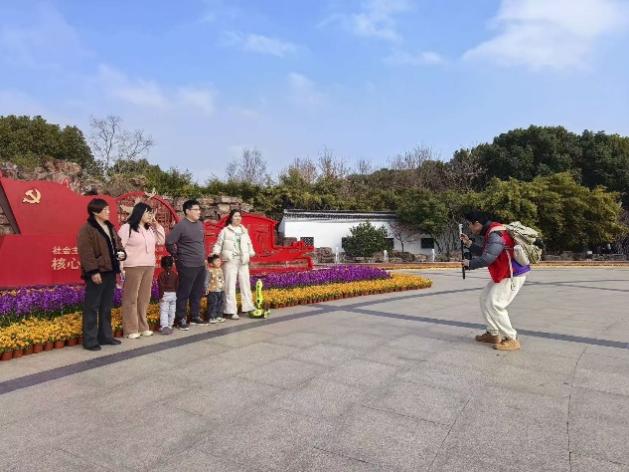 光影服务组则专注于为游客提供拍摄服务。考虑到许多家庭游客尤其是老年人难以拍出满意的合影,队员们主动上前询问是否需要帮助。为了拍出一张以红船为背景的完美照片,队员们反复调整角度,不断变换蹲姿和站位,力求让每一位游客满意。有的队员为了拍出最佳效果,甚至趴在草地上寻找低角度。