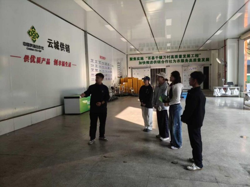 瀚驼丝路队总负责人于佳卉(图右2)、IP孵化负责人刘津津(图右4)、前端开发工程师吴文婷(图右3)、IoT与溯源负责人廖淇彬(图右1)为了解农产品供应链管理、农产品互联网营销等调研访问云浮市云城区供销合作联社。图中为对接人(图左1)为瀚驼丝路队队员讲解农产品供应链技术的场景。