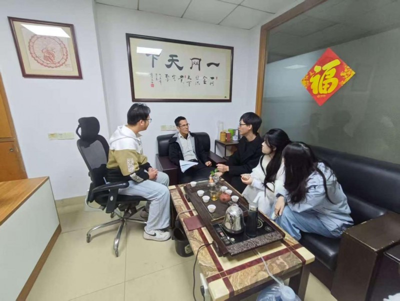 瀚驼丝路队总负责人于佳卉(图右2)、技术架构负责人卢瀚潮(图右3)、智能合规负责人朱鋆喆(图左1)、前端开发工程师吴文婷(图右1)为了解跨境电商行业市场发展现状与趋势走向及未来突破思路分析来到佛山市扬威贸易有限公司走访调研。上图为佛山市扬威贸易有限公司访谈人Agustin(图左2)和瀚驼丝路队进行市场分析。