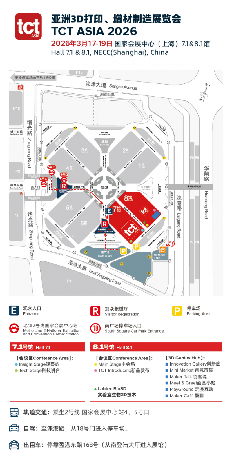 出租车:停靠盈港东路168号(从南登陆大厅进入展馆),或国家会展中心18号门下车。