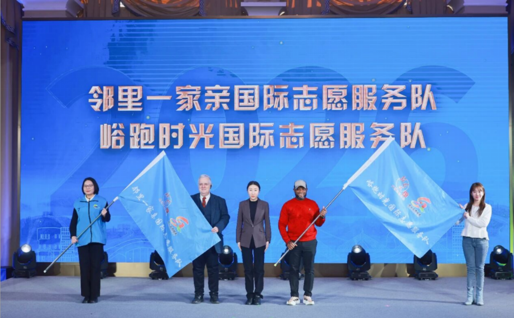 授旗环节成为活动亮点之一,与会嘉宾为We are Family、优 + 等6支国际志愿服务队郑重授旗。这些旗帜不仅代表着荣誉,更承载着连接中外、邻里互助的重大责任与担当。