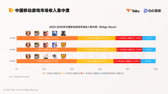 市场竞争从“百花齐放的内容角逐”,日益演变为“少数巨头的生态位守卫战”与“庞大长尾的残酷生存战”,TOP10的“超级产品”持续吸纳用户消费并占据近半市场,新入局者或中型产品实现跃迁的窗口正急剧收窄。