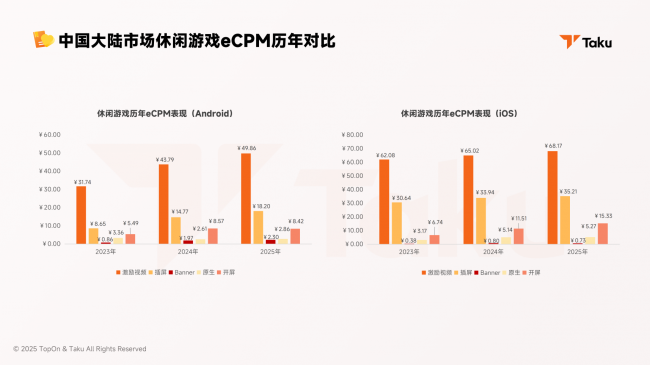 全球手游广告 eCPM 表现排序:激励视频>插屏>开屏>原生>Banner
