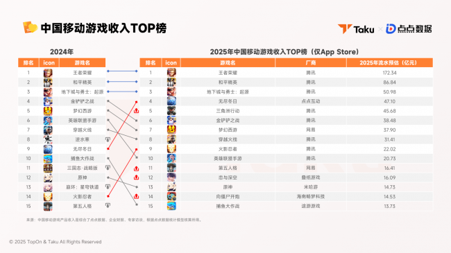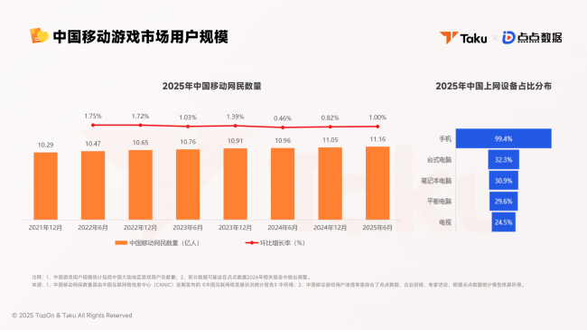 中国移动网民数量在2025年6月达到11.16亿人,近年来始终保持着稳定的增长规模。更为重要的是,截至2025年6月,女性在网络游戏用户中的占比为48.0%,较 2024年底提升3.1个百分点,上升趋势明显;尤其在手机游戏领域,女性玩家已成为主力军之一。就点点数据观察来看,除了《恋与深空》、《光与夜之恋》、《世界之外》等女性向游戏外,移动游戏玩法轻度化的发展趋势也是女性玩家崛起的重要驱动力之一。