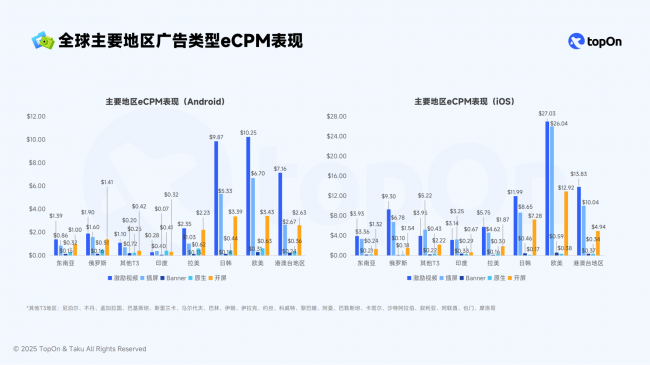 双端eCPM在港澳台、日韩以及欧美市场的表现出色,特别是iOS端,激励视频和插屏广告的eCPM表现尤为强劲;拉美地区整体eCPM与俄罗斯市场差距缩小,该地区本土中重度游戏生态的起步,吸引了更多高预算广告主;东南亚、南亚市场虽用户基数庞大,但受限于用户平均价值与广告主预算分配,eCPM仍处于爬升期。