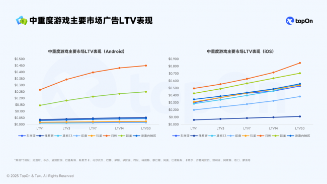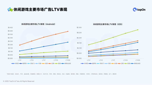 中重度手游 Android 端 LTV7 后增长后劲不足,iOS 端的 LTV 表现在所有市场中普遍高于 Android 端,日韩、欧美市场在 Android 和 iOS 双端均展现出较高的 LTV 价值;休闲游戏双端 LTV 小幅上涨,Android 端日韩、港澳台区域 LTV 领先,iOS 端欧美、日韩表现突出。