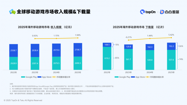 2025年海外移动游戏市场的收入规模增长持续平缓,但下载量发生显著迁移:Google Play的下载量份额从2022年的85%逐渐收缩至74%,而App Store则从15%攀升至26%,标志着高价值用户与核心市场注意力正加速向iOS生态聚集 ,这直接影响了用户获取策略的一大方向——即需要大幅提升App Store的产品页面优化、本地化展示、争取编辑推荐等业务的重要性,甚至在部分地区应提高至与买量投放同等重要的战略高度。