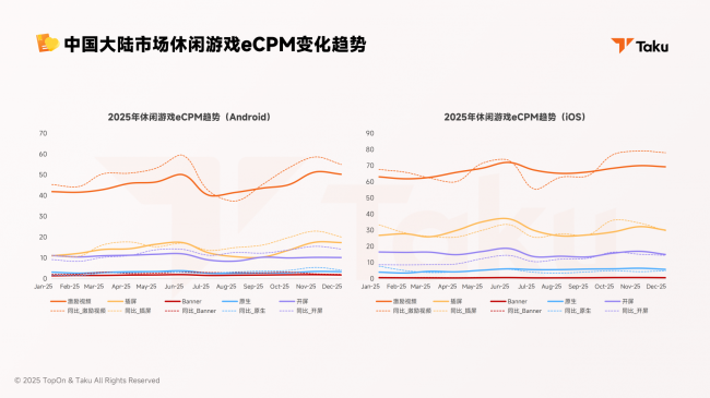 2025年,抖音、微信等小游戏轻量化产品快速崛起,持续分流传统休闲游戏应用的用户时长与广告预算,短期内带动了小游戏的买量需求,广告主更倾向于通过游戏APP的试玩广告引流至小游戏,这也进一步推高了游戏APP的广告价格,但长期来看,游戏APP的用户规模与变现模式将持续承压,行业竞争进一步加剧,倒逼开发者积极尝试多元广告组合以补充收益。