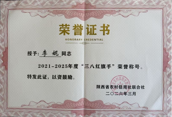 一份荣誉,一份肯定,更是一份激励。此次“三八红旗手”殊荣,是对李妮同志十二年扎根基层、实干笃行的高度认可,更是眉县农商银行广大女职工立足岗位、建功立业的生动缩影。愿全体同仁以榜样为镜、向先进看齐,在服务三农、助力地方发展的道路上勇担使命、续写新篇!