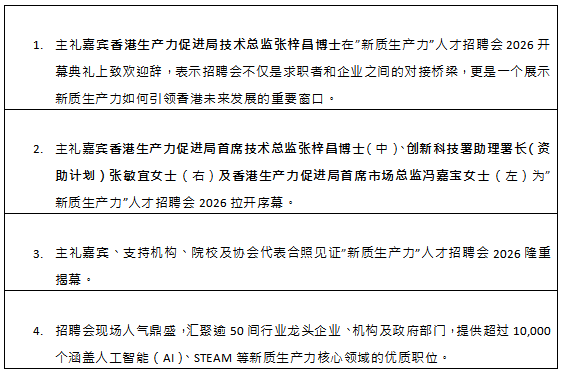 香港 -Media OutReach Newswire- 2026年3月9日 -为积极响应国家”十五五”规划中发展新质生产力及打造香港成为国际高端人才集聚高地,并配合《2026-27 年度财政预算案》的人才发展布局,由香港生产力促进局主办的”新质生产力”人才招聘会 2026于3月7日圆满举行。作为香港生产力促进局推动人工智能及人才发展的年度重点活动,本届招聘会成功吸引逾2,000名来自粤港澳大湾区的大专生、应届毕业生及求职者亲临现场。活动汇聚逾50间行业龙头企业、机构及政府部门,提供超过10,000个涵盖人工智能(AI)、STEAM等新质生产力核心领域的优质职位,成功搭建了高效的双向选择平台,是香港生产力促进局以实际行动落实人才驱动发展战略的重要体现。