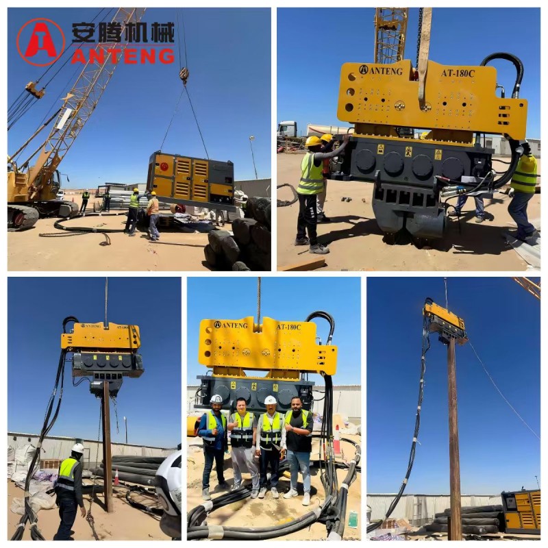 在沙特阿拉伯沙漠腹地,酷热难耐且沙土松软密实,夏季地表温度常飙升至极高水平,加之风积沙层黏聚力低、易塌陷,对打桩设备的耐高温、抗沙尘及稳定性提出极致考验。江苏安腾工程机械有限公司的AT-180C液压振动锤,凭借专为严苛沙漠环境量身打造的核心设计,在这片极端工况中从容驰骋,轻松应对各类打桩任务,用可靠性能为当地基础设施建设保驾护航。
