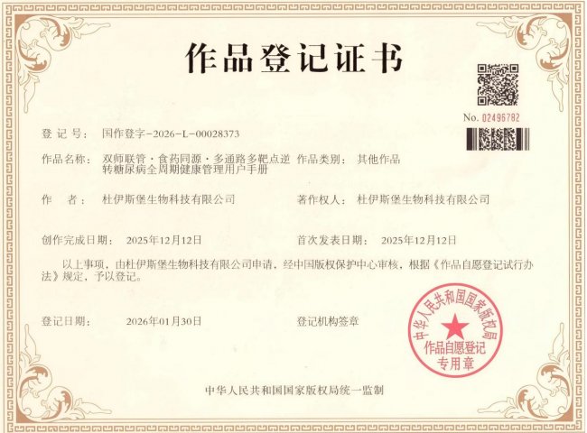 近日,杜伊斯堡抗糖中心原创的《双师联管·食药同源·多通路多靶点逆转糖尿病全流程健康管理用户手册》完成国家版权局登记,取得作品登记证书。这不仅标志着杜伊斯堡的核心抗糖方案获得了国家级知识产权保护,也意味着该方案在糖尿病健康管理领域的创新实践获得了权威性的专业认可。