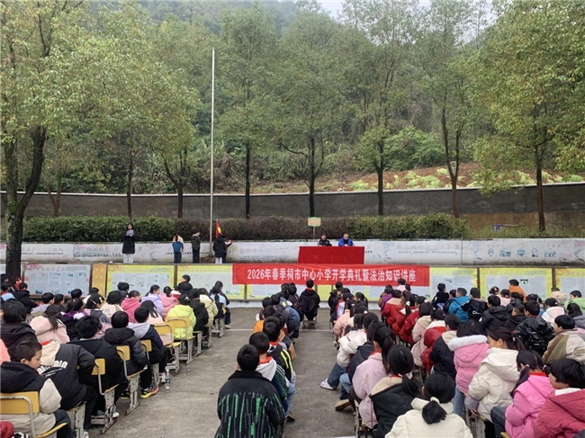 3月10日上午,蓝山县祠市中心小学全体师生齐聚内操场,隆重举行2026年春季学期开学典礼暨法治安全专题讲座。活动由梁雨欣老师主持。