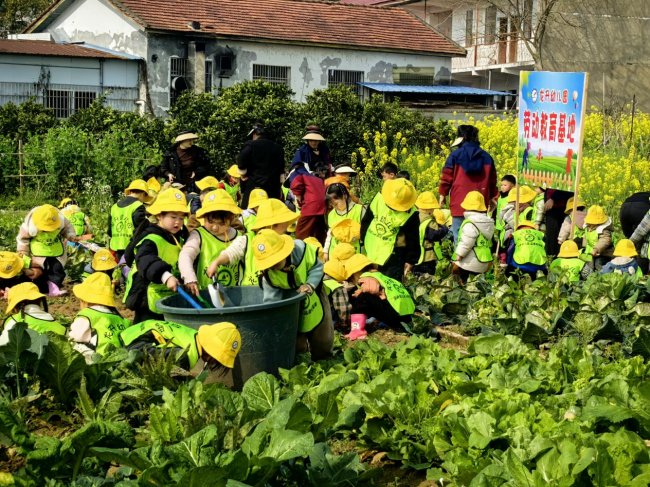 活动当天,孩子们身着统一的小黄帽与荧光绿马甲,排着整齐的队伍,迈着轻快的步伐向劳动教育基地进发,稚嫩的脸庞上满是对田间劳作的期待。抵达田间后,在老师们的悉心指导下,孩子们化身“小小农耕员”,有序开展劳作:有的弯腰拔除田间杂草,有的小心翼翼采收成熟蔬菜,还有的手持小锄头翻松土壤,为后续播种做好准备。大家分工协作、相互配合,在泥土的芬芳中触摸自然、认识作物,在亲手劳作中学习基础农耕技能,真切感受“一分耕耘,一分收获”的道理。