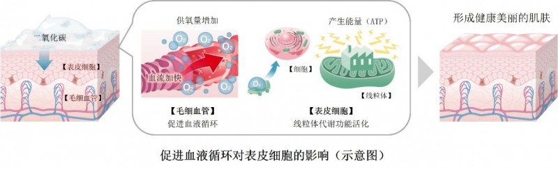 二氧化碳在渗透到皮肤后会扩张毛细血管,从而促进血液循环。基于这一认识,花王提出这样的假设:如果毛细血管扩张使表皮细胞获得更多氧气供应,线粒体的代谢状态可能会随之发生变化,并对细胞本身的功能产生积极影响。本研究以含二氧化碳的配方制剂作为促进血液循环的手段,在人体皮肤上对此进行了验证实验。