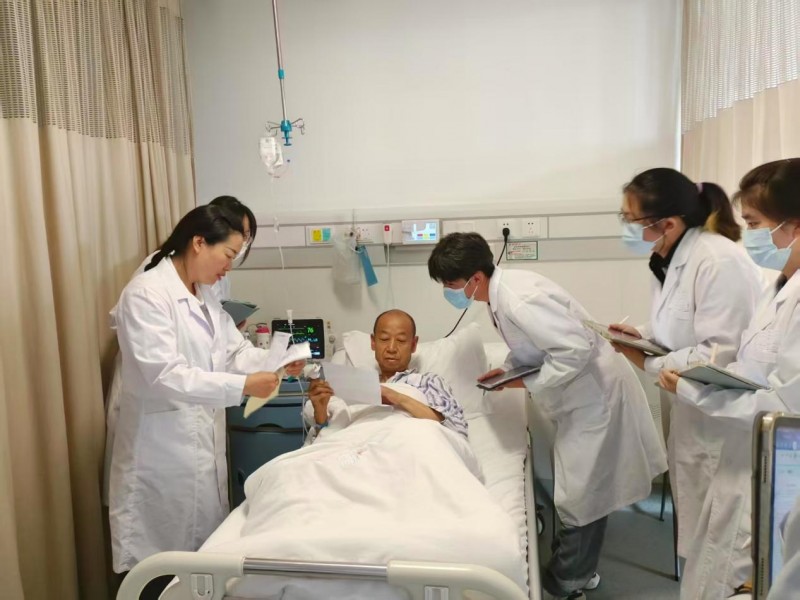 图3:镜探早安团队在昆明医科大学第一附属医院消化内科病房中与病人主管医师一同对术后患者进行随访和答疑