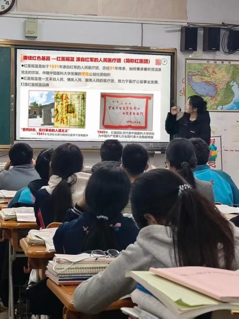 在中学宣讲现场,团队成员将红军医疗团“救死扶伤、实行革命的人道主义”精神与中医“仁心仁术”的核心理念巧妙结合,用生动的战地医疗故事点燃了同学们的爱国热情。随后的推拿体验环节更是将氛围推向高潮,成员们手把手教授颈肩放松的基础手法,从按揉风池、肩井的穴位定位,到轻拍肩背的收尾技巧,让同学们在亲身实操中感受中医外治的舒缓魅力,不少同学课后还主动记录下手法要点,希望能为家人缓解疲劳。
