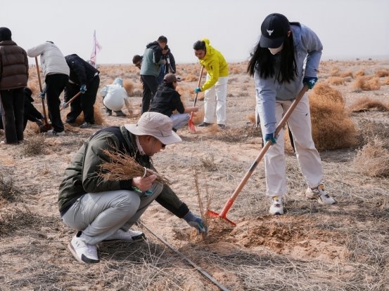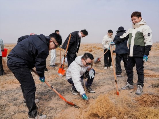 活动现场,决色品牌安排三组人员,一同开展公益植树竞赛,由决色轮值CEO陈能悟、决色品牌VP林芳和决色分销经理杨莉分别担任各小组队长,带领各组在指定区域完成树苗种植,最终由园林指导师与品牌工作人员共同评选出「最佳协作奖」「最美公益林奖」「最快完成奖」。从前期物料筹备、现场环节执行到植树成果落地,决色与代理商代表全程并肩协作,在躬身植绿的过程中深化彼此联结,让 “聚力同行、共生共赢” 的理念成为品牌与渠道的共同共识。为保障公益行动长效落地,决色与当地林业站建立长期合作,为本次种植的梭梭林设立专属养护档案,安排专业人员定期开展浇水、防风、防护等养护工作,以长期主义的公益实践,向渠道合作伙伴传递品牌 “重承诺、重落地、重长效” 的经营理念。