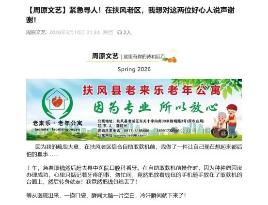 一条特殊的寻人启事,寻的是无名好心人,传的是人间真善美,更是扶风联社坚守金融为民初心的生动缩影。一直以来,扶风联社始终把客户的急难愁盼放在心上,用责任守护群众财产安全,用服务传递信合温度,以实际行动擦亮地方金融品牌,让文明善举在扶风大地持续传递、温暖人心。