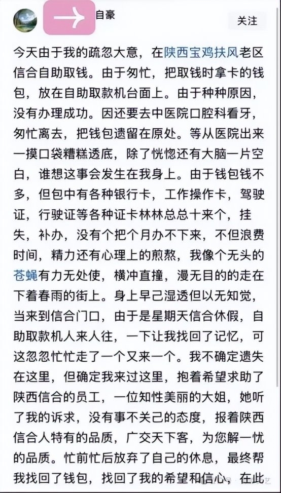 事发当天,该客户因匆忙前往医院就医,不慎将装有身份证、驾驶证、十余张银行卡及重要证件的钱包遗落在城关信用社自助取款机台面。发现遗失后,焦急万分的他抱着最后一线希望赶回城关信用社求助,情绪十分焦急,恰逢网点休息日,值班的工作人员马蓉耐心倾听、全程安抚,主动放下手头工作,放弃休息时间,立即调取监控、多方联络核实,全力以赴帮助客户寻找遗失财物。与此同时,捡到钱包的热心大哥第一时间妥善保管并主动上交,用质朴善举完成了一场爱心接力。在双方的共同努力下,遗失钱包完璧归赵,失主激动不已,在文章的字里行间满是对两位好心人的感激,更对陕西信合员工的暖心服务给予高度赞誉。