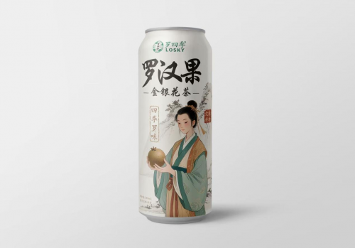 在罗四季LOSKY的品牌设计中,范思齐将东方美学作为核心,以一位手持罗汉果的古风仕女为视觉符号,贯穿于瓶装、罐装等全系列产品包装。瓶装罗汉果金银花茶的标签以浅米色为底,搭配细腻线条勾勒出温婉雅致的仕女形象;罐装产品则以工笔技法绘制亭台楼阁背景,与仕女图共同构成层次丰富的中式画卷,让每一瓶饮品都成为可随身携带的“东方美学载体”。