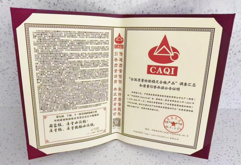2026年315前夕,中国质量检验协会再度发布公告,在“全国质量检验稳定合格产品”调查汇总中,中国黄金集团黄金珠宝股份有限公司(股票简称中国黄金)生产(销售)的“中国黄金ChinaGold”金、银制品及珠宝首饰在2023年1月至2026年1月的相关质量检验中均为合格。