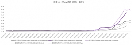 存储芯片方面,因AI存力需求提升、海外大厂产能切换HBM,传统DRAM及NAND类存储芯片价格大幅攀升。NAND:Wafer:512GbTLC现货平均价自2024年3月底小幅回升,10月小跌后趋于平缓,2025年3月起小幅上涨,4月略下滑,7月后加速上涨,2026年2月23日价格为17.95美元。DRAM:DRAM:DDR5(16Gb(8Gx2),4800Mbps)现货平均价自2024年3月小幅上涨,9月后下跌,2025年1月起大幅上涨,12月初小跌后加速上涨,2026年3月6日价格为39.67美元。