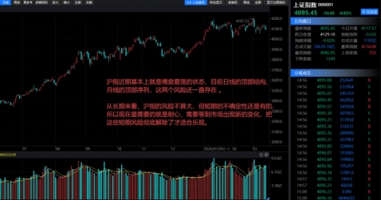 沪指这两个月以来,基本上就是横盘震荡的状态,没怎么大涨也没怎么大跌。目前日线的顶部结构、月线的顶部序列,这两个风险还一直存在 —— 虽然最近沪指比较抗跌,没怎么跌,但并不代表这些风险已经解除了。从长期来看,沪指的风险不算大,但短期的不确定性还是有的,所以现在最需要的就是耐心,需要等到市场出现新的变化,把这些短期风险彻底解除了才适合乐观。
