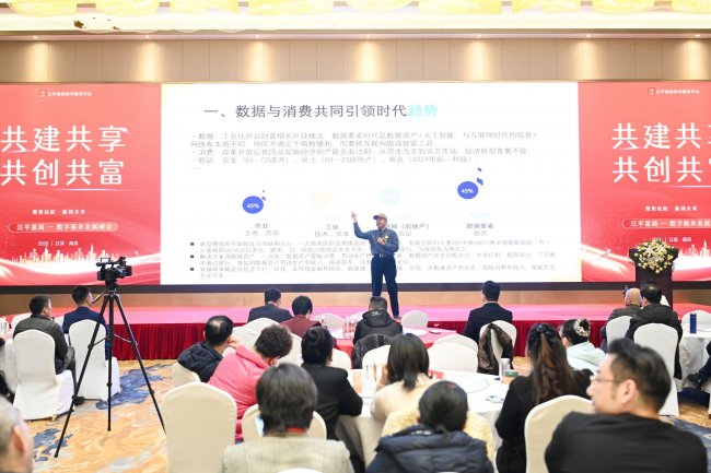 在主旨演讲环节,多位行业专家与企业家分享了前沿洞察与实践经验。江平富商数字服务平台董事长李江平表示,新经济形势下的消费转型,从“流量争夺”到“价值共生”。首先需求分层,实体店追求到店消费,消费习惯转变成网购。其次,渠道重构,直播电商、社交裂变、私域运营颠覆传统货架模式。三是价值回归,消费者不再为品牌溢价买单,而是为“解决方案”投票。江平富商平台通过AI用户画像系统,精准匹配供需两端:为商家提供“千人千面”的营销方案,为消费者打造“所见即所需”的购物场景。他说,平台重构了商业生态的“数字枢纽”。对商家提供“供应链+流量”双重赋能,通过区块链技术实现供应链透明化,降低30%运营成本;为创业者提供选品、物流、售后全链条支持,实现零库存,专注前端服务;为消费者提供优质的产品质量和价值。他表示,平台将在三年内赋能10万家企业完成数字化升级,打造万亿级商业生态。
