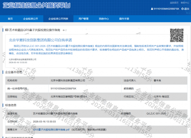 北京,2026年3月16日,北京华夏科技创新集团有限公司正式发布《QRS量子共振检测仪操作指南》企业标准(以下简称“《操作指南》”),并于2026年4月1日起实施。该标准系我国首个针对量子共振技术在艺术品年代检测领域制定的系统性操作规范,标志着该技术从经验化、个体化操作迈向标准化、可复现的新阶段,对提升检测结果的科学性、可信度与行业公信力具有里程碑意义。