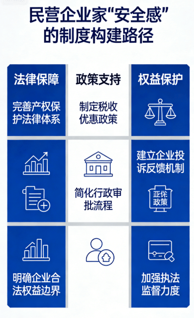 在经济下行压力持续加大、民营企业经营面临诸多困难的当下,让民营企业家获得足够的“安全感”,不仅是司法层面的重要任务,更是关系到经济稳定发展、社会和谐稳定的重大问题。结合刘贵祥专访释放的政策信号,以及中美制度比较带来的启示,可从以下四个维度构建民营企业家更具确定性的法治安全感。