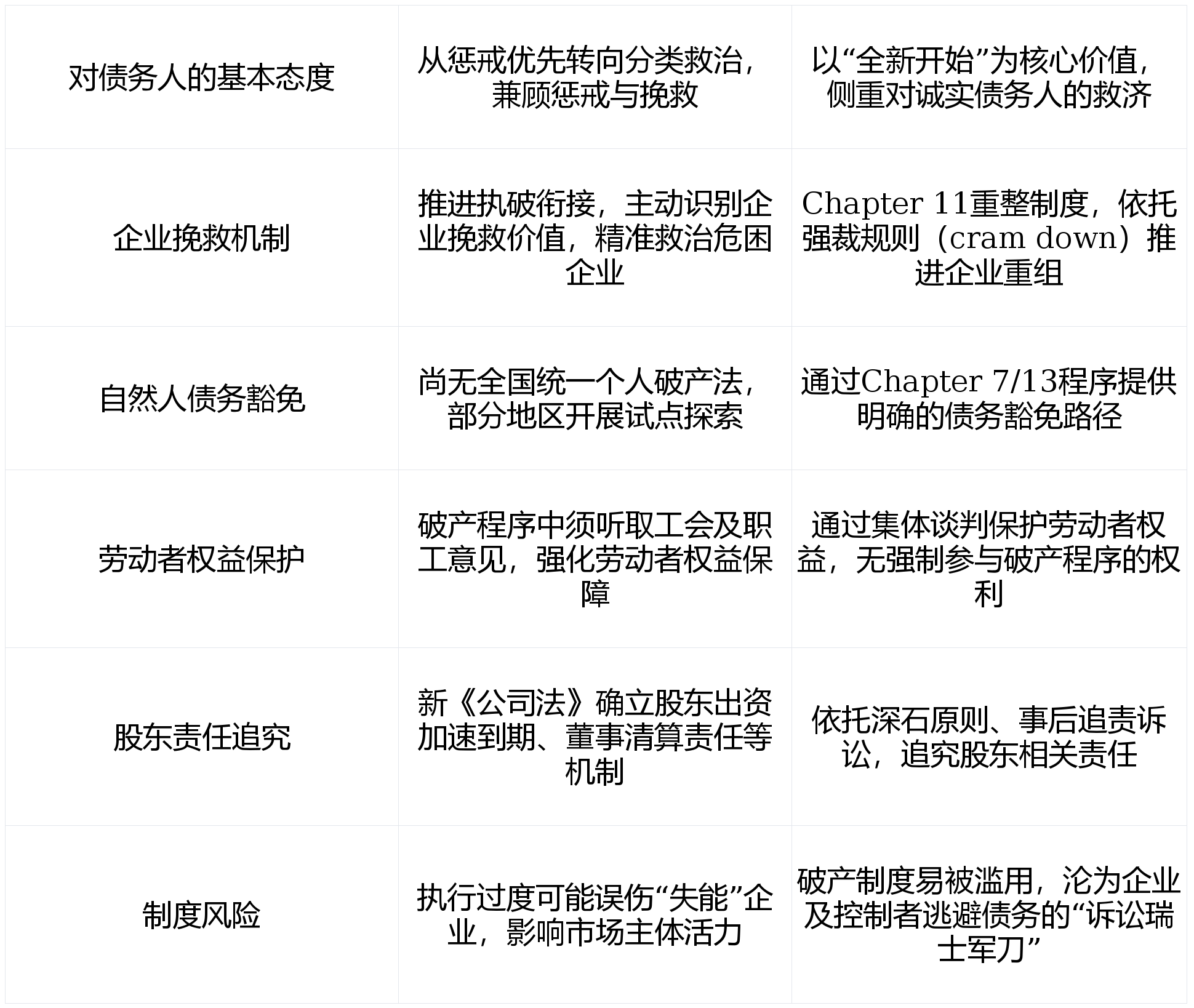 这一对比揭示了一个深刻的制度悖论:美国破产法对自然人债务人的保护相对完善,核心围绕“全新开始”构建救济体系;但对企业(及其背后的控制者)却存在明显的制度漏洞,易被利用为逃避债务的工具。反观中国,执行制度正从对企业的“一刀切惩戒”转向分类救治,注重企业挽救价值的挖掘,但对自然人债务人的宽容度仍有提升空间,尚未建立全国统一的个人破产制度,仅在部分地区开展试点。