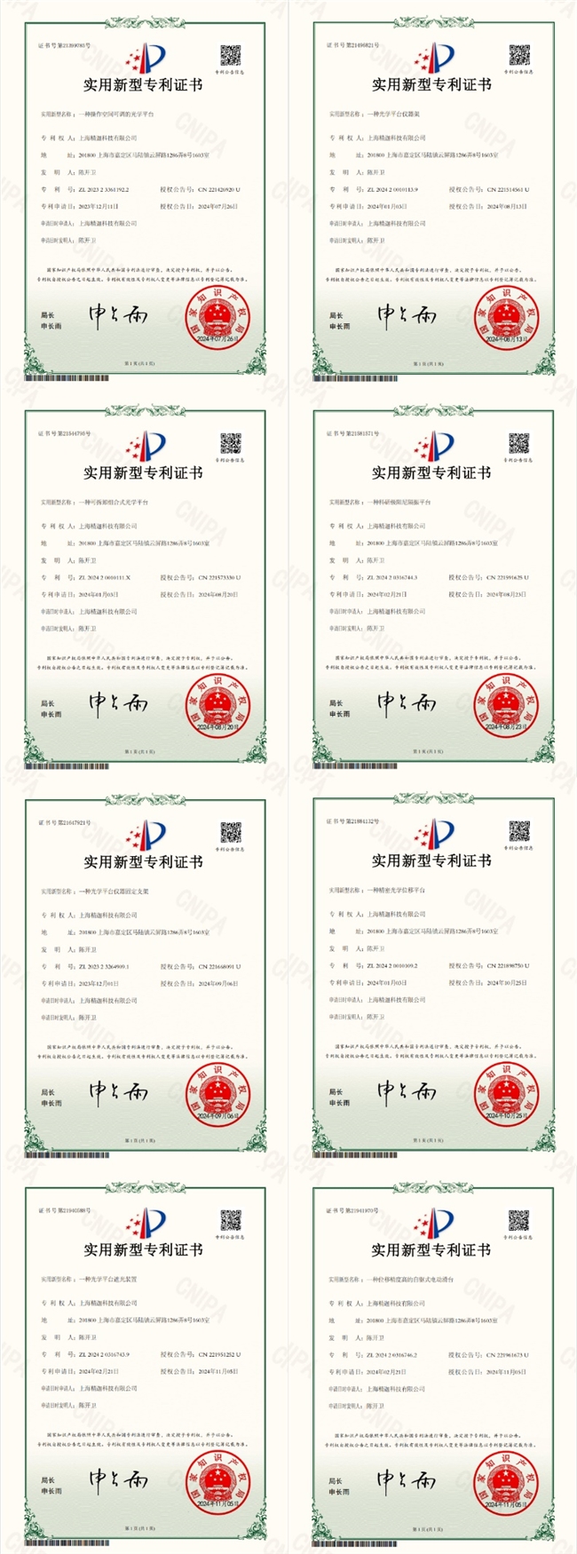 自成立以来,精迦科技秉持 “以市场需求为导向,以产品质量为根本,以诚实守信为原则” 的经营理念,依托上海产业集群优势,构建起研发、生产、销售、服务一体化全产业链体系。公司将研发创新置于战略核心,累计斩获多项实用新型专利,形成覆盖光学平台、电动滑台、手动滑台全品类的 “专利护城河”,从结构优化、精度提升、功能拓展等维度突破传统设备技术局限。