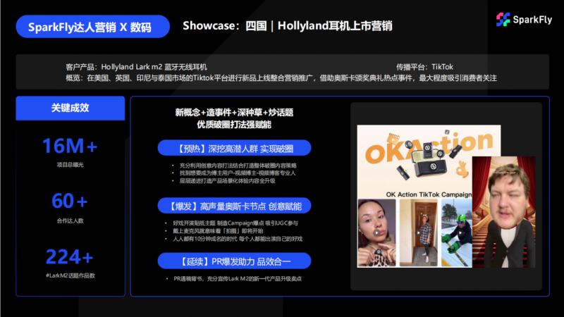 在竞争白热化的全球蓝牙耳机市场,钛动科技携手专业音频品牌Hollyland,为其Lark M2新品在美国、英国、印尼、泰国四国同步上市,摒弃了常规的产品功能宣讲,转而执行一场以“好戏开演”为核心的事件营销。通过精准嫁接奥斯卡颁奖礼的全球热度,将产品与视频创作者的“拍摄瞬间”深度绑定,让“戴上麦克风”等同于“好戏即将开演”。这场整合营销最终实现项目总曝光1600万+、合作达人60+、#LarkM2话题下UGC作品数224+,成功助力品牌从专业影视圈层跃入大众视野。但比数据更值得追问的是:一个原本深耕专业音频的小众品牌,如何借一场热点事件完成跨圈层穿透,让泰国街头的Vlog博主、英国的通勤白领、印尼的年轻妈妈都愿意戴上它?钛动科技的答案藏在四个关键词里:新概念、造事件、深种草、炒话题。