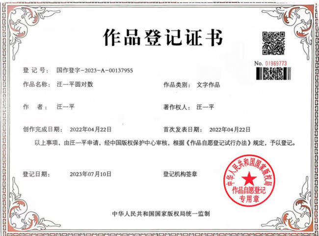 2023 年获得国家知识产权局批准《作品登记证书》。获得中国人工智能学会 2011 年一个 “一等奖”,2022-2023-2024 年三个 “特等奖”。这样一来,圆对数具有独立、自主、创新特征,建立了中国特色的新数学 - 人工智能基础理论。