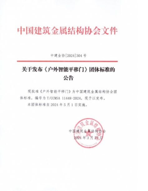 近日,中国建筑金属结构协会正式发布了《户外智能平移门》团体标准,该标准于2024年5月1日正式实施。这一标准的制定和实施,不仅标志着我国在户外智能平移门领域迈出了规范化、标准化的重要一步,而且为行业的持续健康发展注入了新的活力。