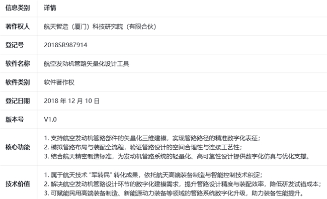 为进一步夯实航空动力数字化技术布局,深化航天技术军转民成果转化与应用,近日,航天智造(厦门)科技研究院正式完成对航空发动机管路矢量化设计工具软件著作权(登记号:2018SR987914)的并购,标志着研究院在航空动力数字化领域的知识产权布局进一步完善,为高端装备制造领域的技术创新与产业赋能注入新动能。