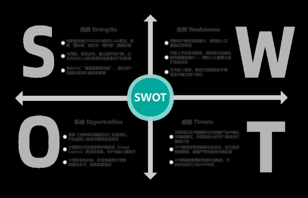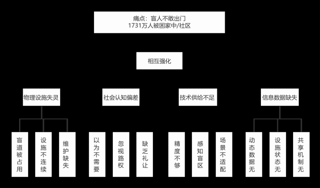 我国视障群体规模庞大,出行自主化、安全化始终是社会关注的民生问题。在现实生活中,城市无障碍设施维护不到位、盲道被占用等情况时有发生,导致视障人士缺乏稳定的出行保障;传统盲杖功能单一,无法对高处障碍物、来往车辆、路口路况等进行全面识别,独立出行存在较高风险;市面上多数导航软件未针对视障群体做专属优化,公共交通信息获取不便,进一步加剧了视障人士外出的困难。受这些因素影响,大量视障人士被迫缩减外出活动,生活空间受限,难以充分参与社会生活,实现平等出行的需求十分迫切。正是基于对这一社会痛点的深刻感知,前图智行队确定研发方向,致力于打造一款真正贴合视障群体需求的出行辅助工具。