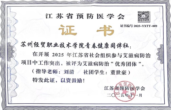 2025年,因在艾滋病防治工作中表现突出,苏州经贸职业技术学院青春健康同伴社获评江苏省社会组织参与艾滋病防治项目“优秀团体”。这份荣誉,既是对社团十余年深耕校园、扎根实践的充分肯定,更是对董世豪等一批批青年志愿者扎根基层、服务社会的生动褒奖。而刚刚过去的这个寒假,社团社长董世豪用一场特殊的返乡实践,让这份荣誉在乡土大地上接续发光,书写了高校学子反哺家乡、践行担当的青春篇章。