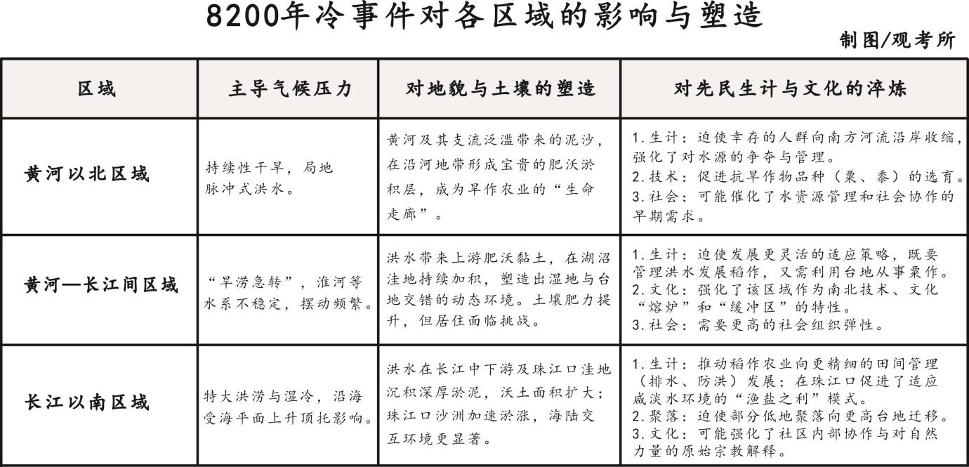 当“甘棠安期”的文明星火在距今约8200年前于三大区域已成燎原之势时,全球气候系统再次拉响了警报。一次被称为“距今8200年冷事件”的气候突变,如同一次精准的“倒春寒”,骤然降临。尽管此次事件的年降温幅度(约3℃—4℃)和持续时间(核心降温期约200年)远不及“新仙女木事件”,但对于已经建立起初步定居农业、人口持续增长、社会日趋复杂的先民而言,这不亚于一次严峻的“生存淬炼”。人类和动、植物因持续的严寒和食物短缺而大量死亡,文明的发展就此突然间被无情地打断。一百多年后,绝大多数的古人类活动区又被淤泥深埋在地下,无声地叙说着当年的惨烈。