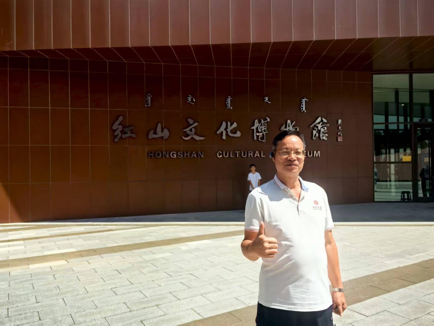 图为东莞市观音山森林公园开发有限公司董事长黄淦波在红山文化博物馆考察学习留影。
