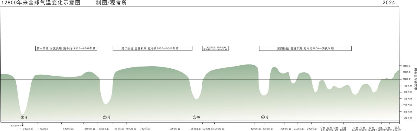 第一,来自气候学的精确重建与全球对比。现代科学家们通过格陵兰冰芯的氧同位素、中国石笋的生长纹层、深海沉积物中的微体化石等一系列“地球档案”,重建了万年以来的全球气温变化曲线。数据显示,约12800年前、8200年前、5500年前、4300年前,全球均发生过显著而快速的气候剧烈降温事件。其中,距今约12800年—12000年前的“新仙女木事件”最为剧烈,全球年均气温在较短时间内陡降约7℃—8℃(作为参照,2024年全球平均气温约为15.10℃,粤港澳大湾区年均气温为23.3℃),对当时全球生态系统和早期人类社会造成了近乎毁灭性的冲击。