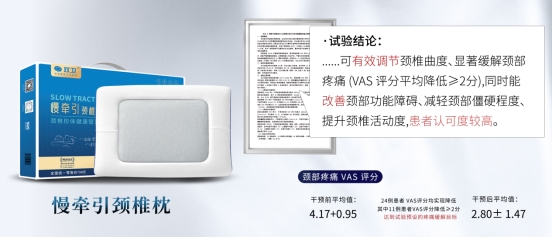 在此背景下,专注颈椎康复与睡眠健康领域的双卫医疗深耕技术研发与临床研究,其慢牵引颈椎枕、慢牵引助眠枕两款核心产品经三甲医院临床验证取得显著成效,以硬核医学成果践行 “健康第一” 理念,为全民睡眠健康与颈椎防护提供科学解决方案,契合《“十四五” 国民健康规划》中加强睡眠障碍干预的国家健康战略要求中国政府网。